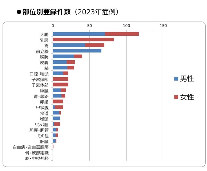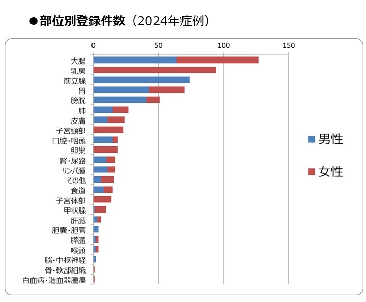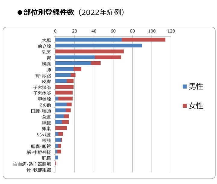 ・大腸がん、前立腺がん、乳がんの罹患数が特に多いのが分かります。